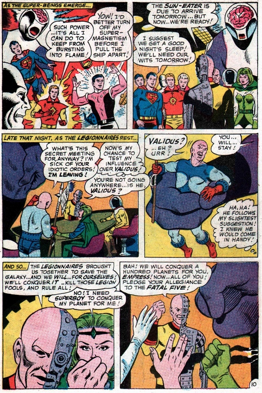 Tharok gives all of them power enhancements via an anti-energy machine. While doing this Tharok  takes the opportunity to sap Validus' will and make him his slave. Later that night, the five villains get together secretly. Tharok suggests that if they survive the confrontation with the Sun-Eater that they stay together to rule the galaxy, starting with the murder of the Legionnaires. Although Persuader is not keen on the idea at first, Validus controlled by Tharok is able to convince him---!
