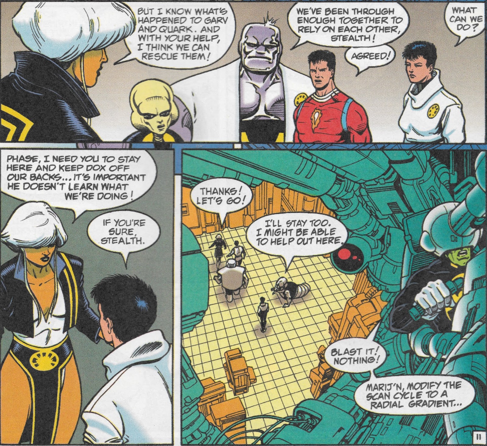 On Cairn, the rest of the team confronts Dox about their missing teammates and realizes that he has sent them on a special mission. He explains that he noticed a spacecraft heading towards their star system that was blocking his attempts to analyze it. He felt that Lady Quark, their most powerful member, and Garv, who was silicon-based, would be best built for the rigors of their mission. Stealth quietly retreats from their meeting because she suspects she knows what is going on.