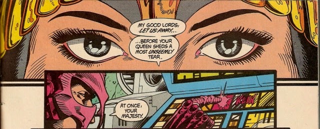 And here we get the pay-off for this saga: Queen Projectra stands up for herself, her dead husband, and her world. What a great characterization of an otherwise "weak" character. When I was reading Legion I always thought Princess Projectra was one of the weaker members. And in her initial attack here (and with her attack last issue) it was like, throw some obvious illusions at your foe and hope something scares him. Sure. Here, what exactly happens? Does she make Nemesis Kid see Death, as she uses fighting techniques her husband taught her to actually kill him? Or does she use no "power" at all, leaving him nothing to "adapt" against? Either way, this is one of the strongest sequences ever to appear in a Legion story. Hats off to Paul Levitz for writing this and to Steve Lightle for choreographing it.