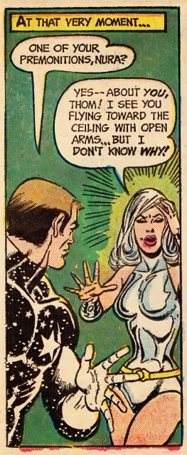 When Superboy and Supergirl were forced to resign from the Legion due to a green kryptonite cloud surrounding Earth's atmosphere, they named their own replacements: masked characters calling themselves Sir Prize and Miss Terious. After two issues, these were revealed to be Star Boy and Dream Girl, who were allowed to officially rejoin. During this time, it was revealed that Nura had a younger sister, Mysa, the White Witch, but was otherwise an orphan.