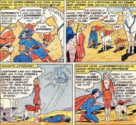 Saturn Girl has an idea and off the Legion goes, in their time bubble, to pick up other Super-Pets, including Streaky the Super-Cat, Beppo the Super-Monkey, and from "our" near future, Comet the Super-Horse!